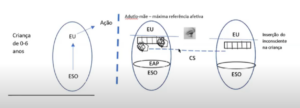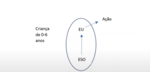 Nesse gráfico, representando uma a criança entre 0 e 6 anos que ainda não tem a matriz reflexa, ela não possui uma divisão significativa entre o inconsciente e consciente. Então, não tem o superego, as regras, vai fazer o que quer fazer num determinado momento que é bom para ela. Na hora que tem fome chora, precisa ir ao banheiro, etc. Sente a necessidade e faz. Direção entre o Em Si ôntico, o Eu e a ação.
