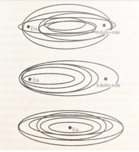 Aqui tem a relação diádica com o adulto mãe e a criança representada como “Eu”. Lembrando que esse adulto poderia ser o pai, uma professora, a mãe adotiva, ou seja, aquele de máxima referência para a criança. No primeiro gráfico vocês verificam que o Eu da criança e o adulto-mãe, são a mesma coisa. A criança depende biologicamente, então a proximidade é muito alta, quase como se não houvesse uma distinção. Se estabelece um campo de relação entre os dois. De fato, mesmo depois do cordão umbilical ser cortado, permanece uma ligação de dependência inclusive biológica. Quando o bebê nasce ele não enxerga nada além da mãe. Só existe a mãe. Ela e a mãe são a mesma coisa.